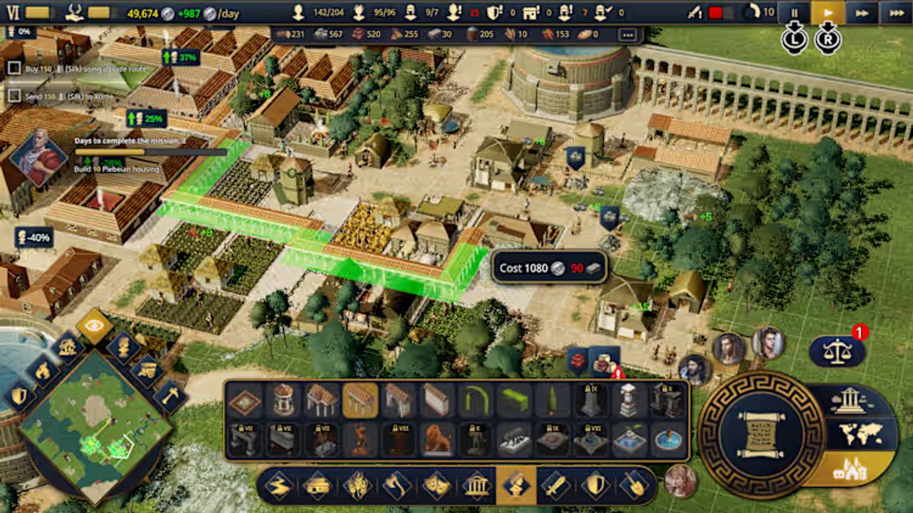 Build your settlement. Gather and refine resources from forests and quarries, breed animals, grow vegetables, fish and make wine, so you can keep your population healthy and fed. Improve your buildings and ensure water supply with aqueducts. Welcome citizens to your village as artisans, farmers, carpenters… or train them to join your legions in different units. Towers and walls will protect your village from barbarian attacks, while it grows into a magnificent city.