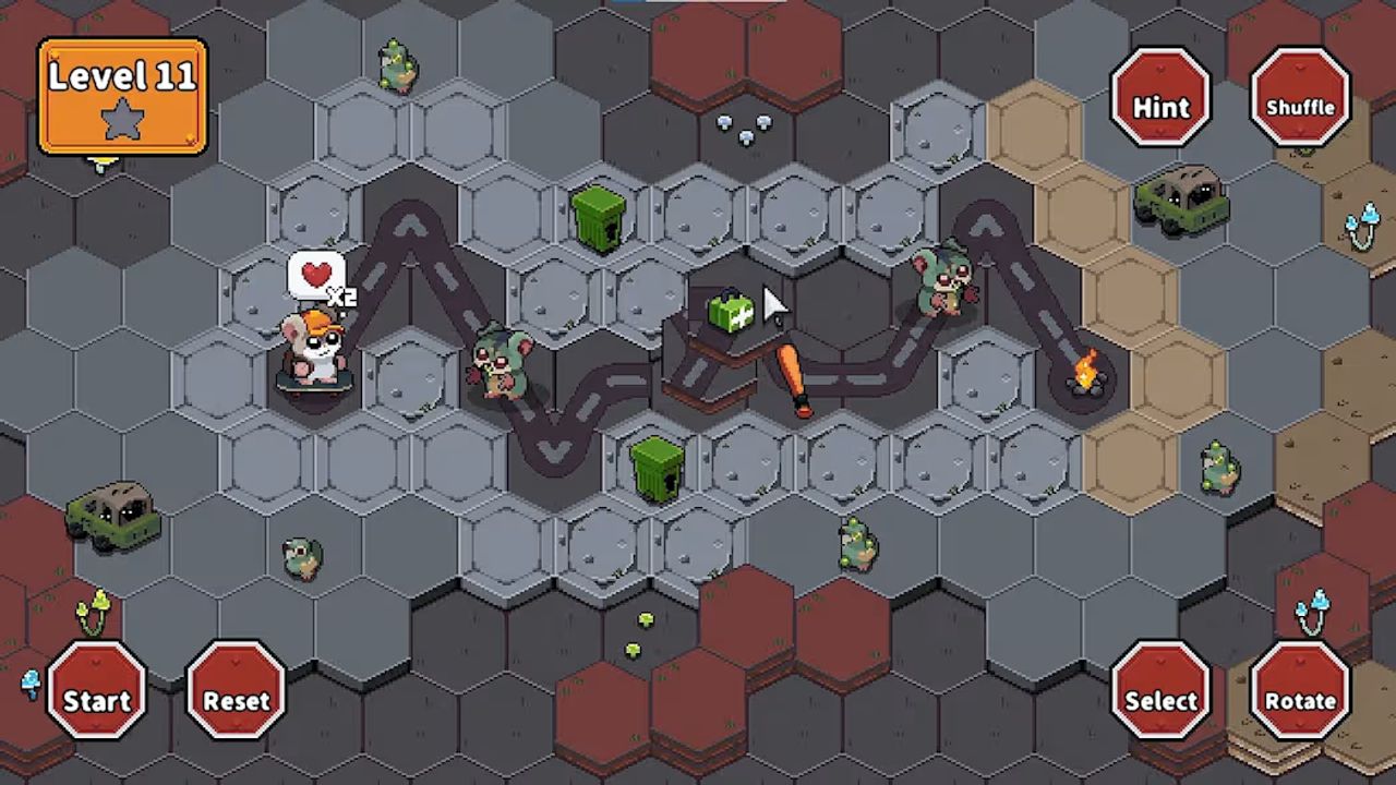 The hexagonal path tiles can be rotated and repositioned, creating continuous and strategic routes. Each level requires all tiles to be used, combining obstacles, enemies, and resources in creative ways. Zombies block progress, baseball bats allow defeating them, and medical kits heal wounds, but only in specific positions.