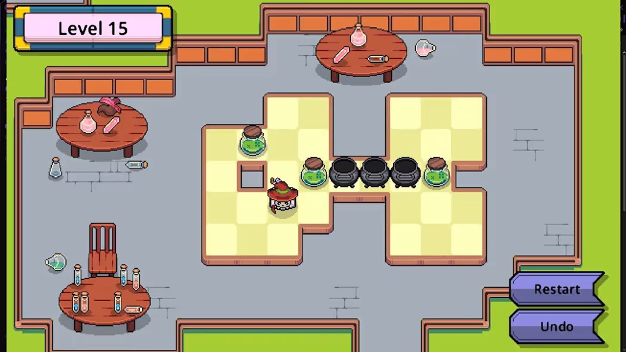 Observe the classroom where each cauldron awaits its perfect potion. Push bottles, plan your route, and avoid getting stuck while solving each enchanted mini-puzzle. And if something goes wrong, no worries — undo or restart is always just a paw away.